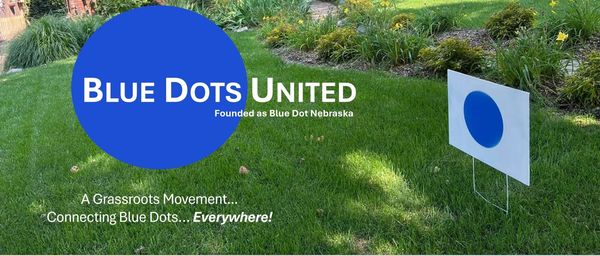 Blue Dots United, (founded as Blue Dot Nebraska) originally focused on "one Blue Dot" Nebraska's second congressional district, (CD-2). The group has since grown it's focus to "Blue Dots Everywhere"! Large cities, small towns, urban, rural... every left leaning individual is a Blue Dot... and we are uniting!